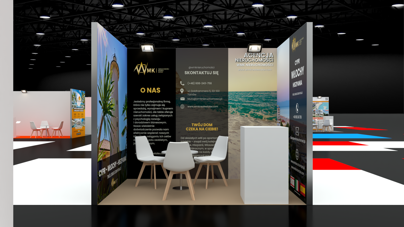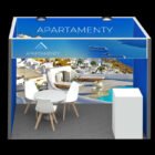 W komplecie otrzymujesz wszystko, co potrzebne do profesjonalnej prezentacji na targach – od ścianek i lady, przez hokery i stoliki, aż po krzesła i wykładzinę (w ilości przedstawionej na wizualizacji). Każdy element został starannie dobrany, by zapewnić Ci pełną wygodę oraz estetyczny, spójny wygląd ekspozycji. Gotowe rozwiązanie – bez stresu i zbędnych przygotowań